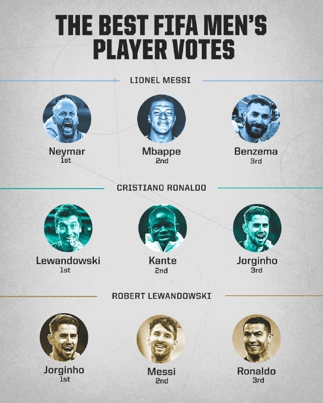 可以看到,梅西没有给莱万和C罗投票。
