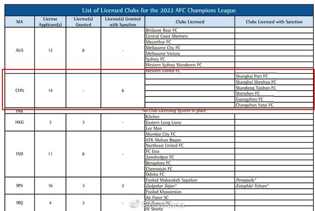 亚足联公布2022亚冠牌照名单 中国只有6支球队