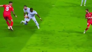 在皇马对塞维利亚的比赛中,阿拉巴有一个绊倒奥坎波斯的动作,但主裁判没判罚点球。(伊万)
