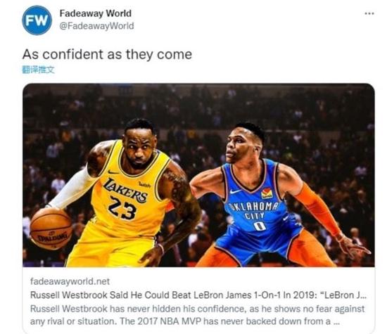 北京时间1月19日,洛杉矶湖人昨日以101-95击败犹他爵士,球队结束了三连败。比赛中,威少隔扣戈贝尔之后,美媒竟然出来搞事,FadeawayWorld转发了威少关于詹姆斯的当年霸气言论。