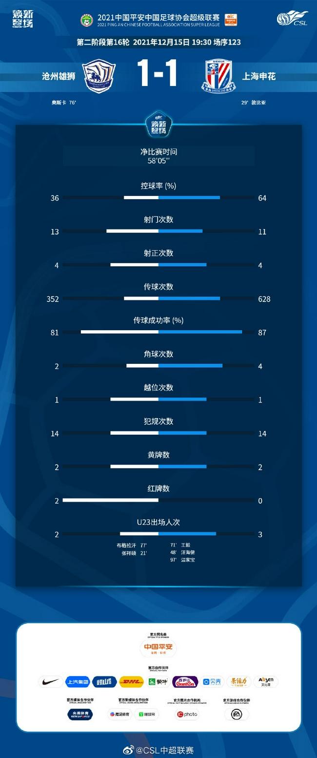 第76分钟,廖承坚右路传中到禁区内,奥斯卡后点头球破门,沧州雄狮1-1上海申花。