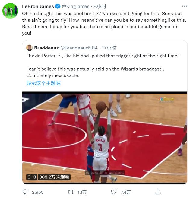 詹姆斯为小波特发声 怒批奇才解说争议言论